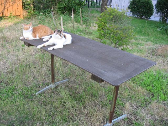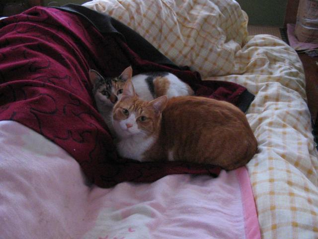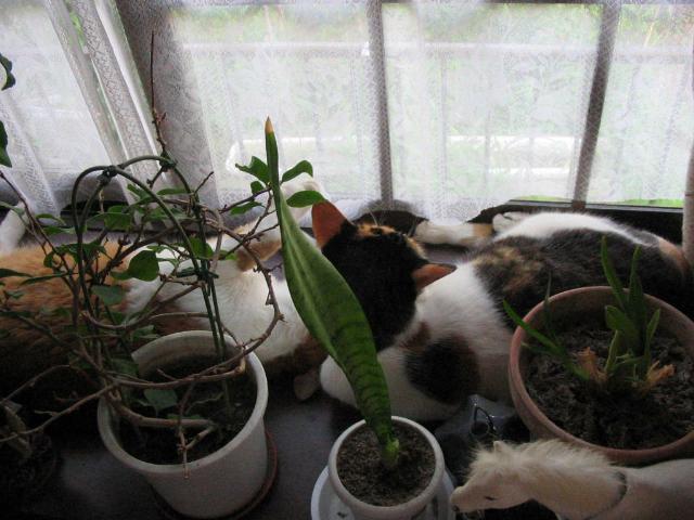 出窓でくつろぐアブとミケ。寝るのはかまわんが、植木鉢を落とすな!!(2度ほどやられた)