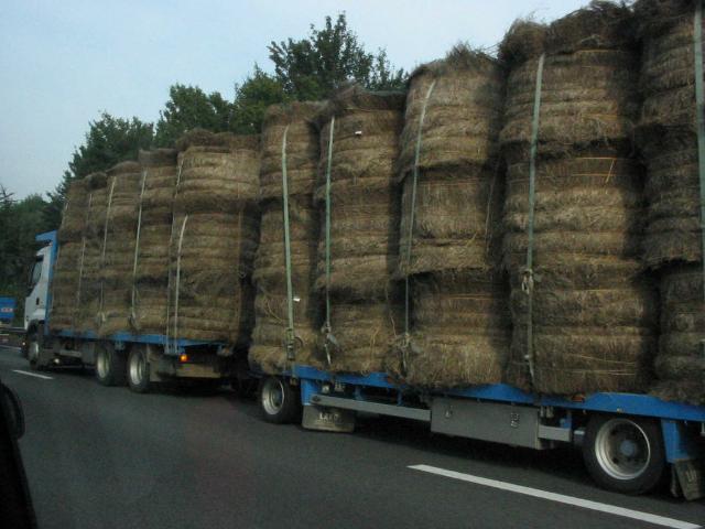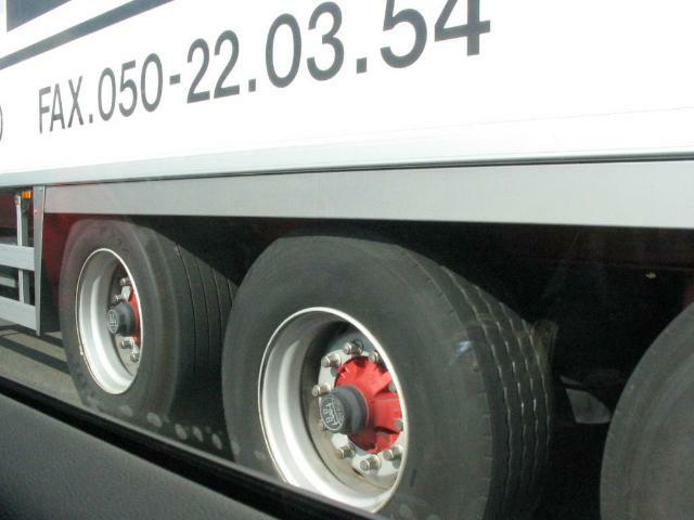 ブリュージュに向かって移動中にみかけた、タイヤを上げたトレーラー。燃費向上とタイヤの磨耗防止らしい。