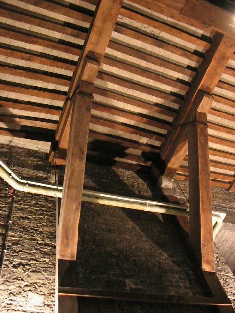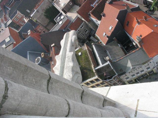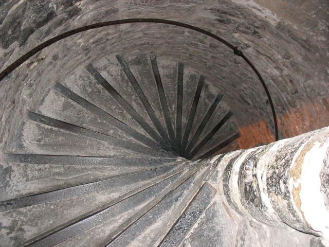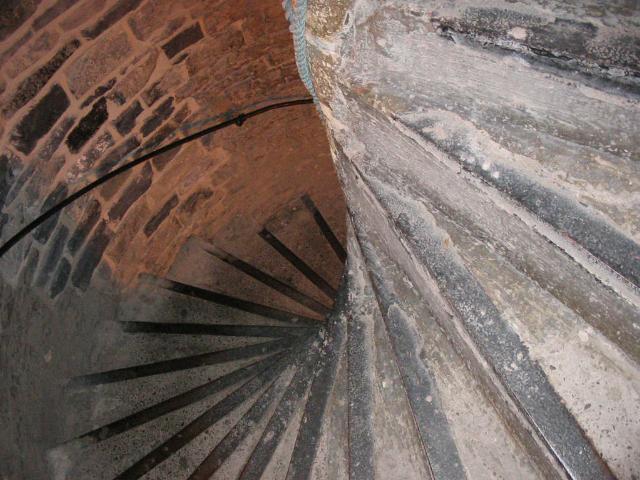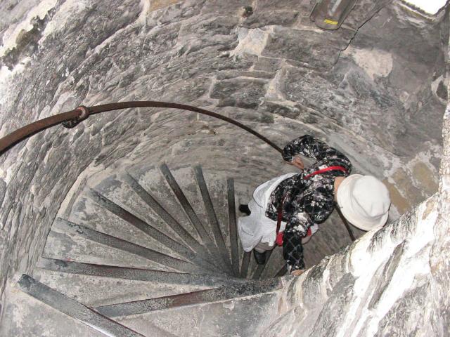 鐘楼 Belfortに登る。ここもこんな階段だった。なお、左巻きの螺旋階段は、戦いの際に上にいる方が右手を使えず不利なので、戦城では右巻きの螺旋階段になっているんだそうな。