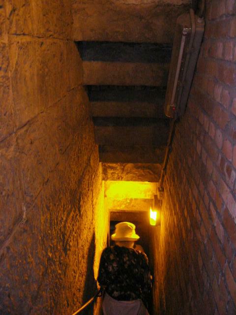 登りも下りもものすごく細く、離合困難のため、一方通行になっていた。しかも蛍光灯が切れていてかなり暗い。こっちの太った人は通れないな。