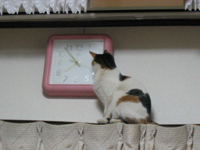びくびくみけちゃん。とても臆病。時計の針の動きに興味をそそられたらしい。