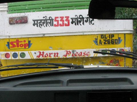 ▼ バスの後ろには、ホーン、プリーズ、と書いてあった。