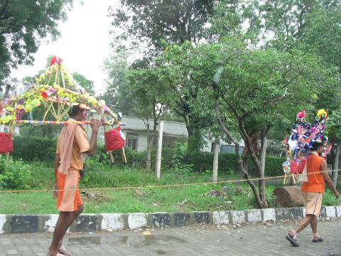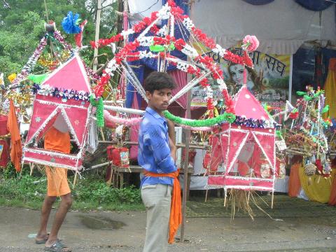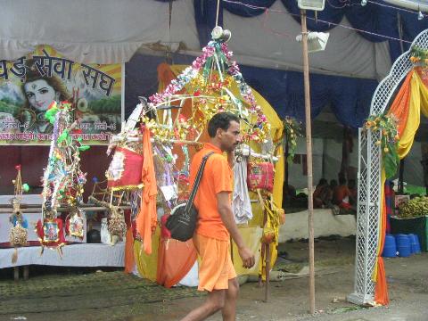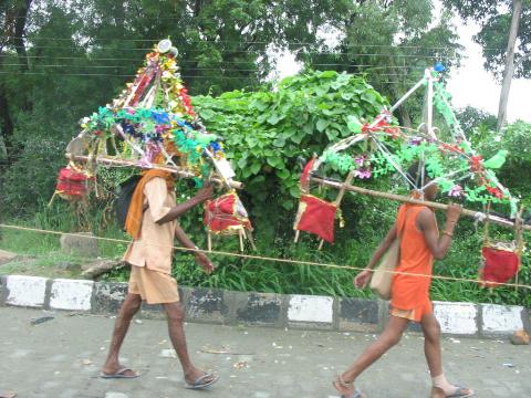 巡礼の方法は、オレンジ色の服を着て、飾り付けした天秤棒をかついで、聖地バラナシのガンジス川を目指すというもの。そのため、あちこちでこういう風景を見かけた。