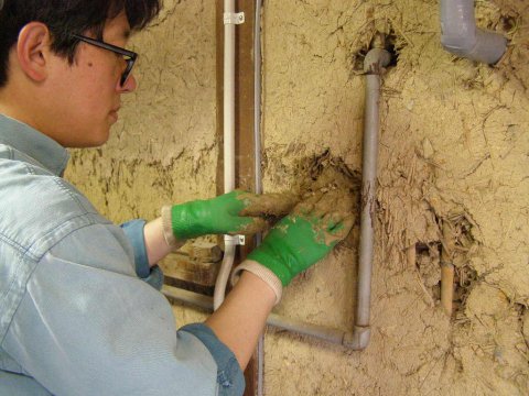 穴に、荒壁用の土を、つめつめぬりぬりしていきます。