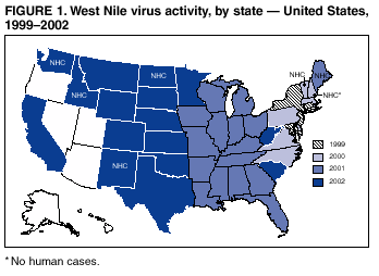 1)。米国で最初にWNVが発見された年には16州1,929郡からであった。1999年から2001年の間の感染者数149名であったが、2002年には3,389名が報告され、多数のWNV感染陽性の鳥類、ウマ、蚊族も同様に報告された。